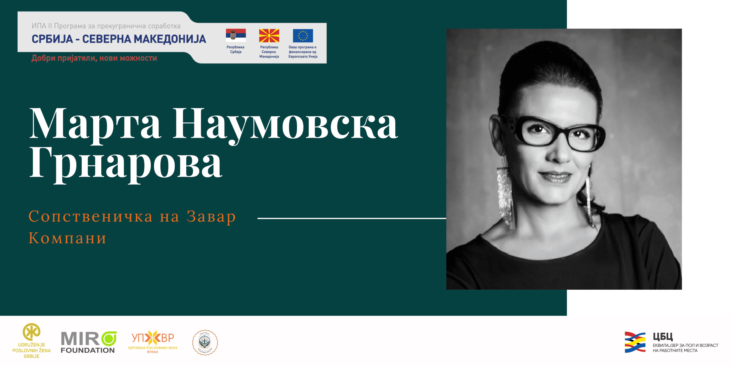 Во рамките на проектот „ЦБЦ еквилајзер за пол и возраст на работните места“ започнавме серија интервјуа за промоција на добри практики, истакнувајќи го придонесот на жените кои работат во традиционално машки индустрии. Преку нивните искуства и успеси се стремиме да ги охрабриме и мотивираме целните групи на програмата. Разговараме со Марта Наумовска Грнарова, сопственичка и извршна директорка на „Завар Компани“.